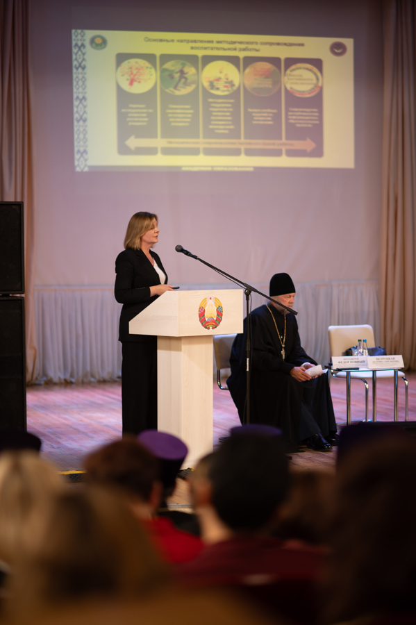 Значимость системной работы ресурсных центров, их сетевого сообщества, координирующая роль Республиканского ресурсного центра по духовно-нравственному и патриотическому воспитанию явились предметом выступления Г.И. Николаенко, подчеркнувшей, что Академией образования разработаны методические рекомендации по деятельности ресурсных центров по духовно-нравственному и патриотическому воспитанию на 2025–2026 учебный год, критерии оценки деятельности ресурсного центра данной направленности, главной целью которых является качественный анализ работы. Была освещена также работа над проектом Программы сотрудничества Министерства образования с Белорусской Православной Церковью на 2026–2030 годы.