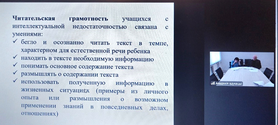 В работе онлайн-семинара приняли участие ученые научно-исследовательского центра Академии образования – Хруль Ольга Станиславовна, заведующий лабораторией специального образования, доктор педагогических наук, доцент; Еленский Николай Георгиевич, главный научный сотрудник лаборатории специального образования, доктор педагогических наук, профессор; Юрок Татьяна Николаевна, ведущий научный сотрудник лаборатории специального образования, кандидат педагогических наук, доцент.