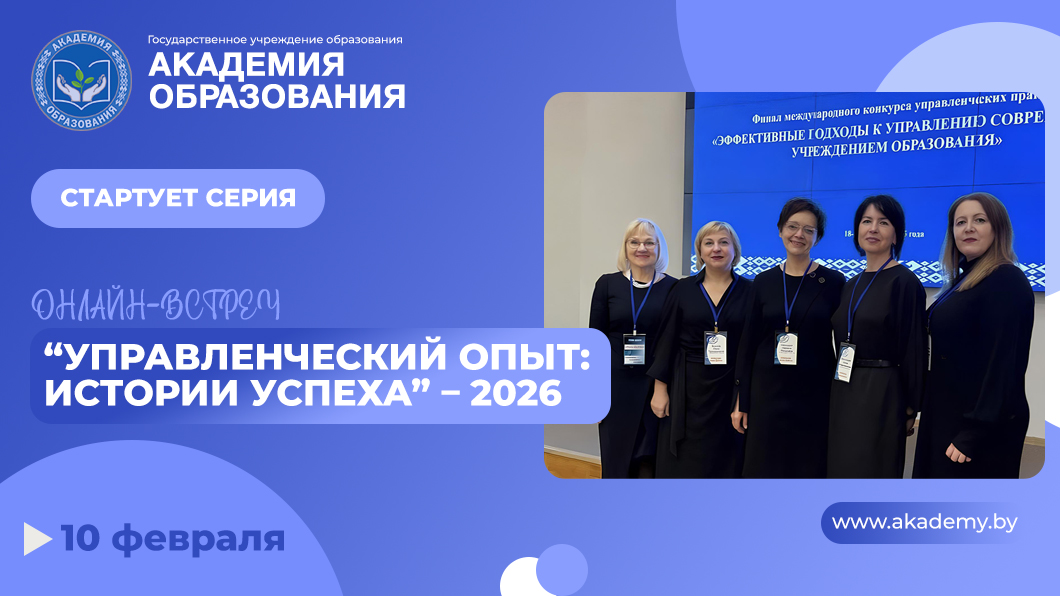 В Академии образования стартует серия онлайн-встреч «Управленческий опыт: истории успеха» – 2026 с руководящими работниками, достигшими высоких результатов в управленческой деятельности, для руководителей, заместителей руководителей учреждений образования, специалистов организаций, осуществляющих научно-методическое обеспечение образования на районном (городском) и областном уровне, курирующих работу с руководящими кадрами.
