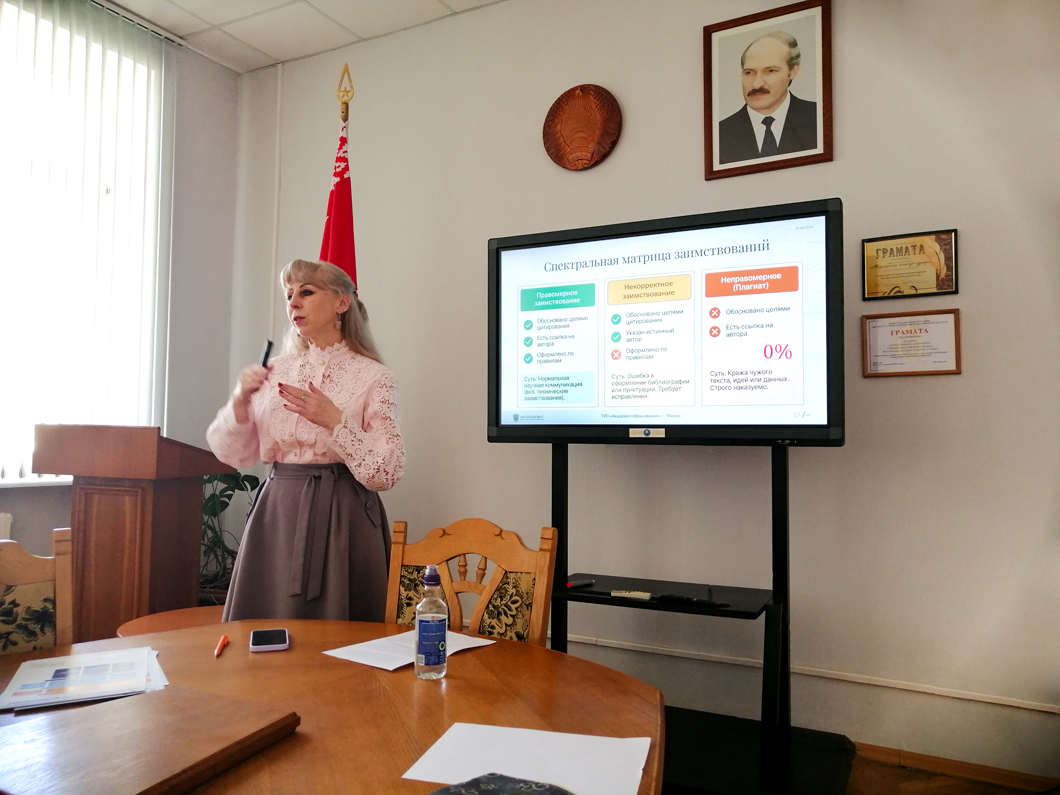 В семинаре приняли участие научные сотрудники, докторанты, аспиранты и соискатели Академии образования. В качестве спикера выступила официальный представитель компании «Антиплагиат» в Беларуси по обучению Ирина Борисовна Стрелкова, докторант кафедры педагогики и менеджмента образования Академии образования, кандидат педагогических наук, доцент.