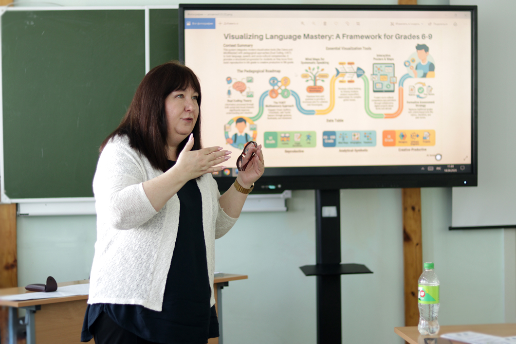 Координатор мероприятия, методист высшей категории управления дошкольного и общего среднего образования Академии образования Татьяна Леонидовна Бибик, открыла практикум, выступила с теоретическим обзором «Формирование коммуникативных умений учащихся средствами визуализации» и практическим мастер-классом «Визуал не заменяет речь, а запускает ее».